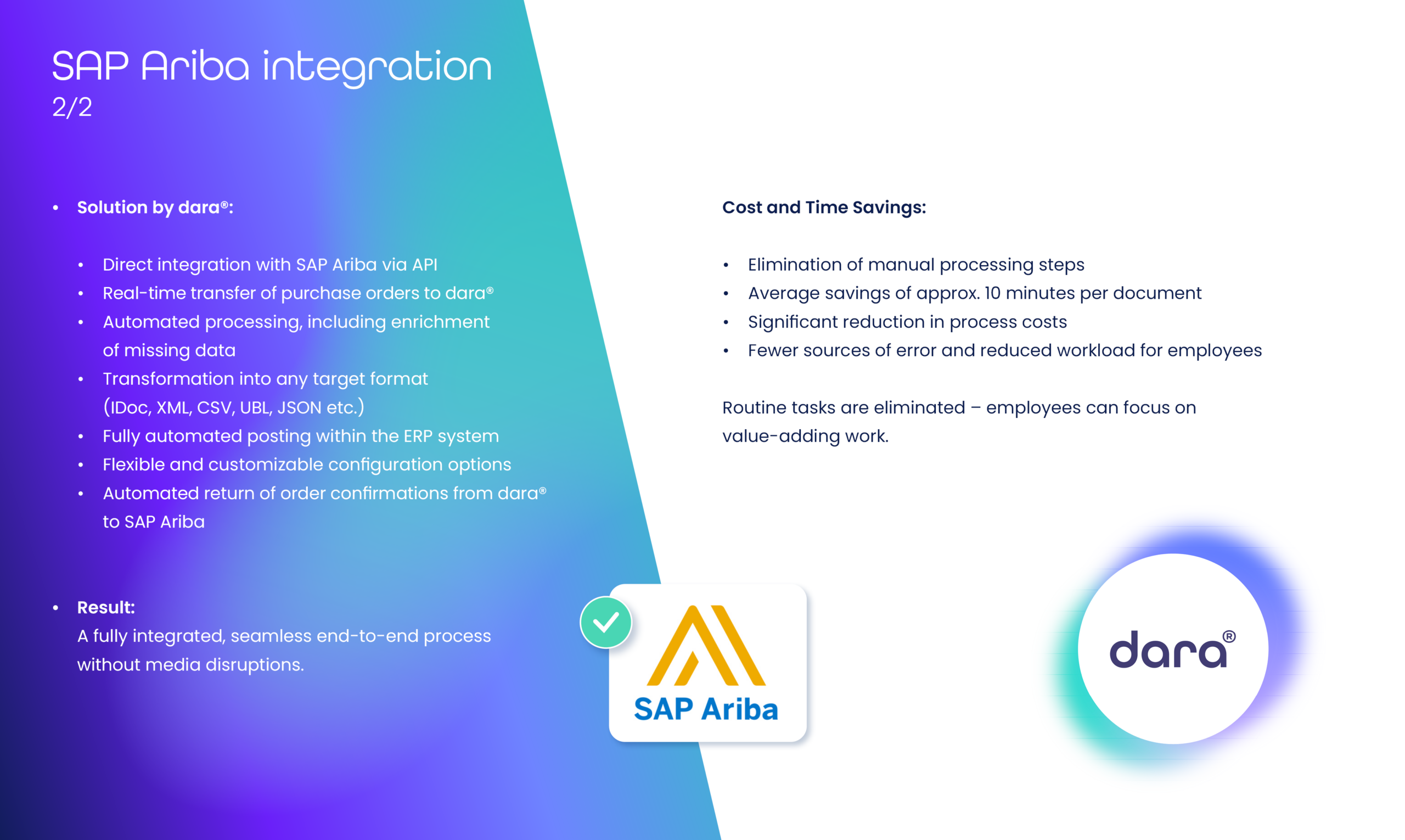 dara® Use Cases Download Use Cases PDF FESTO Success Story Networking Data Enrichment Automation of manual activity Intuitive Interface I Intuitive Interface II Passive connection PDF Processing Integration via Middleware ERP connection 1:1 SAP Ariba Integration
